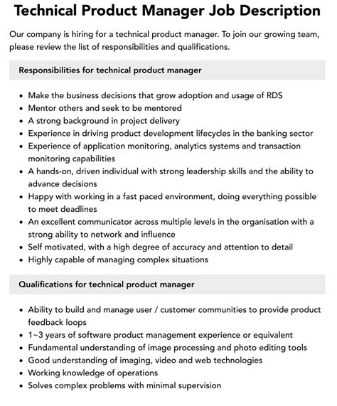 technical product manager job description example